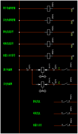 前三個為氣缸磁性開關檢測信號,后兩個為配套PLC傳送給機器人大包和托盤準備好的信號,為了實現(xiàn)電氣隔離,需要將PLC給機器人的電平信號轉(zhuǎn)化為機器人自身的電平,需要通過繼電器來實現(xiàn)。