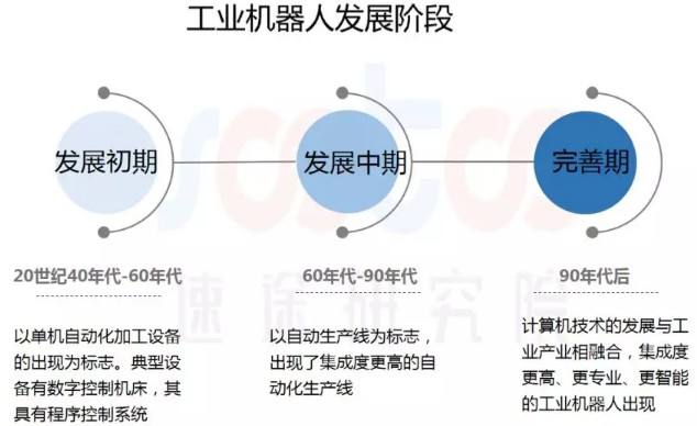 20世紀(jì)40年代到60年代是工業(yè)機(jī)器人發(fā)展的初期,以單機(jī)自動化加工設(shè)備的出現(xiàn)為標(biāo)志,典型的設(shè)備為1952年麻省理工研制的數(shù)字控制機(jī)床,其具有程序控制系統(tǒng)。相比于傳統(tǒng)手工業(yè),自動化加工設(shè)備的優(yōu)勢更加明顯,更加能適應(yīng)批量化生產(chǎn)的需要,并逐漸取代了人工的位置。