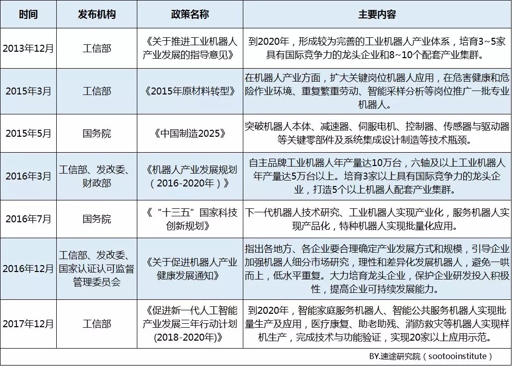 我國工業(yè)機(jī)器人市場的快速發(fā)展,離不開國家政策的大力支持。2015年5月,《中國制造2025》文件里提到,要突破機(jī)器人本體、減速器、伺服電機(jī)、控制器、傳感器和驅(qū)動器等關(guān)鍵零部件及系統(tǒng)集成設(shè)計(jì)制造等技術(shù)瓶頸。2016年3月,工信部、發(fā)改委、財(cái)政部三部門聯(lián)合印發(fā)《機(jī)器人產(chǎn)業(yè)發(fā)展規(guī)劃(2016-2020)》,文件提到自主品牌工業(yè)機(jī)器人要年產(chǎn)10萬臺以上,六軸及以上工業(yè)機(jī)器人年產(chǎn)量達(dá)5萬臺以上,并打造5個以上機(jī)器人產(chǎn)業(yè)集群。